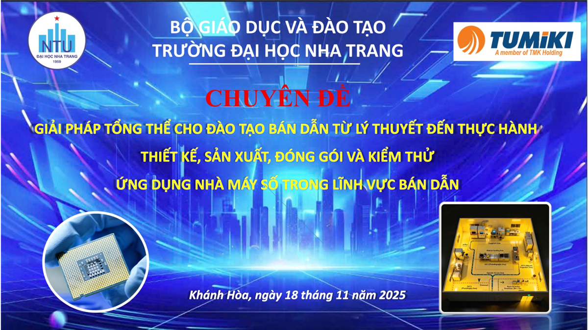 Nhằm tăng cường hiểu biết và tạo cơ hội tiếp cận thực tế về Công nghệ Bán dẫn và Nhà máy số cho giảng viên, sinh viên các Khoa Điện – Điện tử, Cơ khí và Kỹ thuật Giao thông; đồng thời đẩy mạnh kết nối hợp tác giữa Nhà trường và doanh nghiệp, Trường Đại học Nha Trang trân trọng thông báo và kính mời Quý Thầy Cô, Quý Anh Chị và các bạn Sinh viên tham dự chương trình giới thiệu, trao đổi hợp tác cùng Công ty Cổ phần TUMIKI.